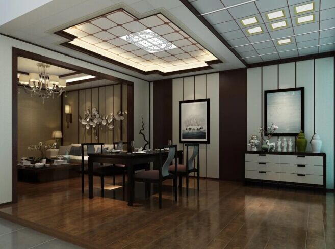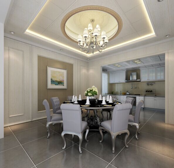 餐廳整體顏色勻而不亂,既沒有像純色吊頂那樣枯燥、單調(diào),也沒有過分繁復(fù)、夸張,設(shè)計(jì)師在原本純色的吊頂上添置了一些花紋圖案,這些花紋在燈光的渲染下,極致典雅。圓形吊頂凹進(jìn)去的部分邊緣和四周都留有光源,圓形頂中間掛有燈飾,如此充足的頂部光線并不會(huì)讓深色的餐桌顯的沉悶沒有活力。