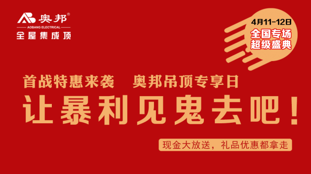 新裝品質(zhì),精彩不斷。品質(zhì)奧邦,全心為你。四月中旬奧邦吊頂專享日,奧邦總部聯(lián)合全國(guó)經(jīng)銷商,特惠全國(guó)消費(fèi)者,為您的溫馨家居添一份驚喜。