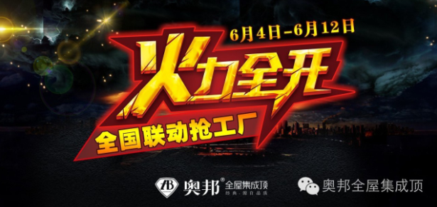 現(xiàn)小編了解到:為了能夠讓更多的消費(fèi)者擁有既健康又時(shí)尚的家居生活,現(xiàn)奧邦全屋集成頂特別推出“6月4日-12日,火力全開(kāi)”大型全國(guó)聯(lián)動(dòng)促銷(xiāo)活動(dòng)!